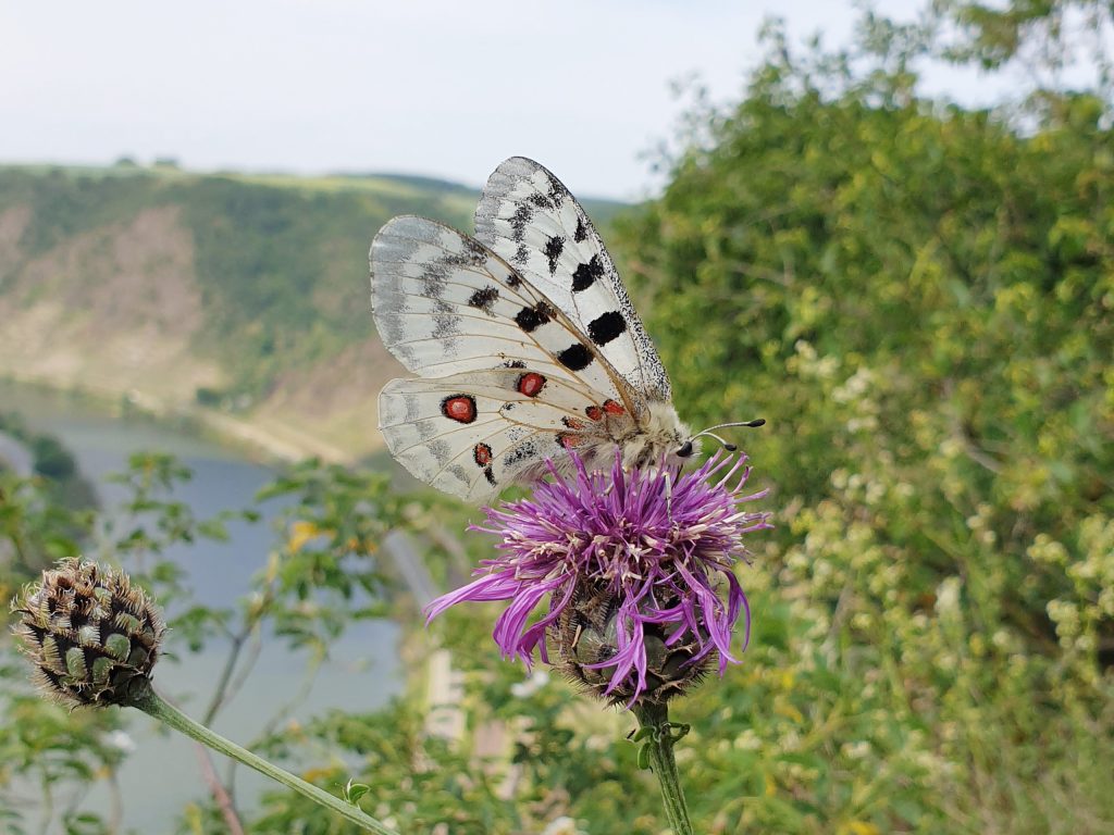 Ein besonderer Schmetterling der Mosel – so könnte man den Mosel-Apollofalter (Parnassius apollo vinningensis) umschreiben ohne die anderen wunderbaren Arten herabzustufen. Und dennoch ist er viel mehr als das! Der majestätische Falter ist eine Unterart des Roten Apollos, der einzig im Moseltal zwischen Winningen und Bremm seinen Lebensraum hat. Er gilt als endemische Art in diesem sehr begrenzten Gebiet. Viel Aufmerksamkeit wird ihm nicht nur von Schmetterlingsfreundinnen und -freunden entgegengebracht. Der schöne Falter begeistert durch seine Größe und die auffällige Flügelzeichnung mit den charakteristischen roten Augenflecken. Spätestens wenn man das Glück hat, den Mosel-Apollofalter bei seinem eleganten Flug im Lebensraum entlang der Moselberge zu bestaunen, ist das Herz berührt von der Schönheit und der Anmut des inzwischen seltenen Falters.