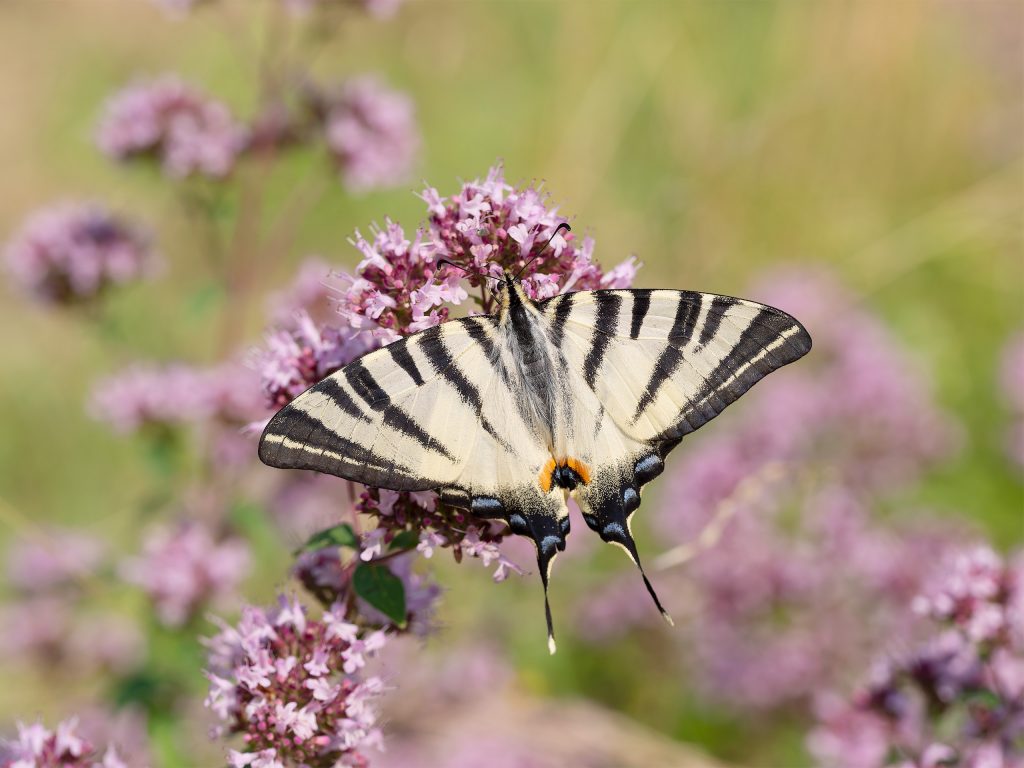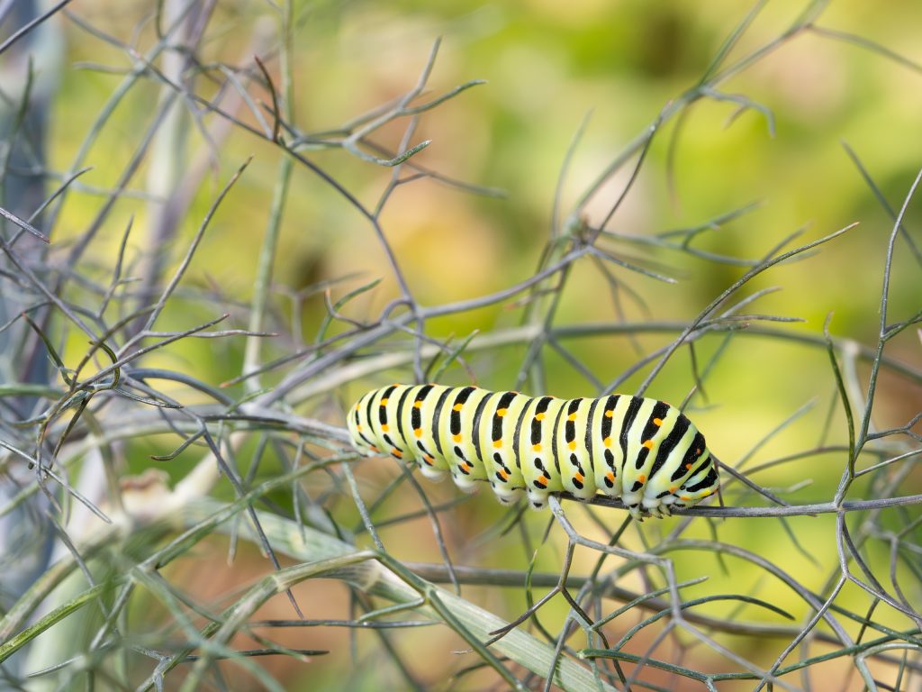 Nicht nur der wunderschöne Falter, sondern auch die Raupen des Schwalbenschwanzes mit der beeindruckenden schwarz-grün-orangen Färbung fallen auf.