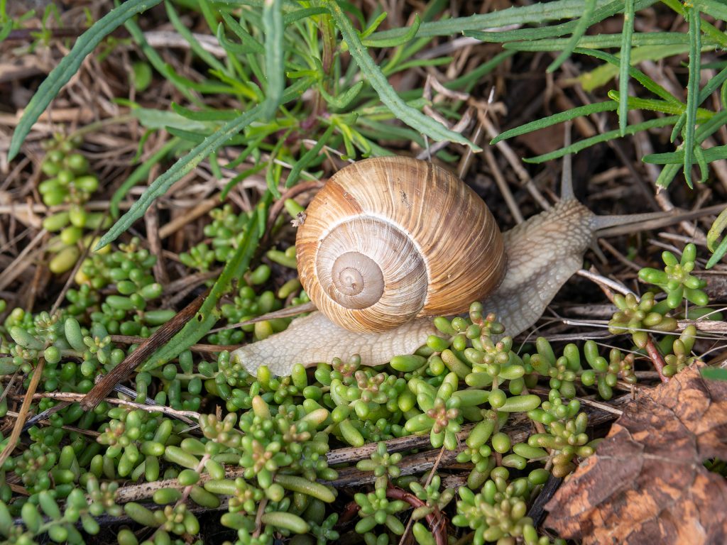 Die größte heimische Gehäuseschnecke und typisch für die Weinbaulandschaft ist die Weinbergschnecke. Ihr Haus kann eine Höhe von bis zu 5 cm erreichen. Wenn es regnerisch und nass ist, kriechen sie zahlreich umher.
