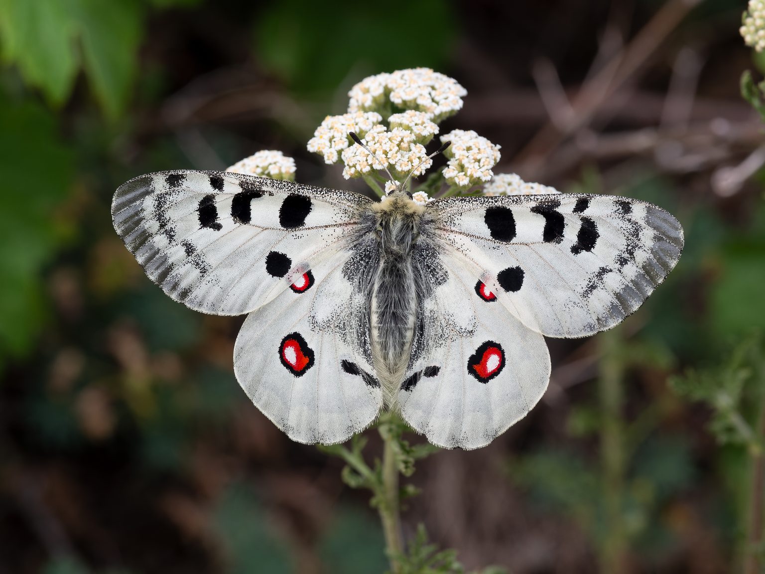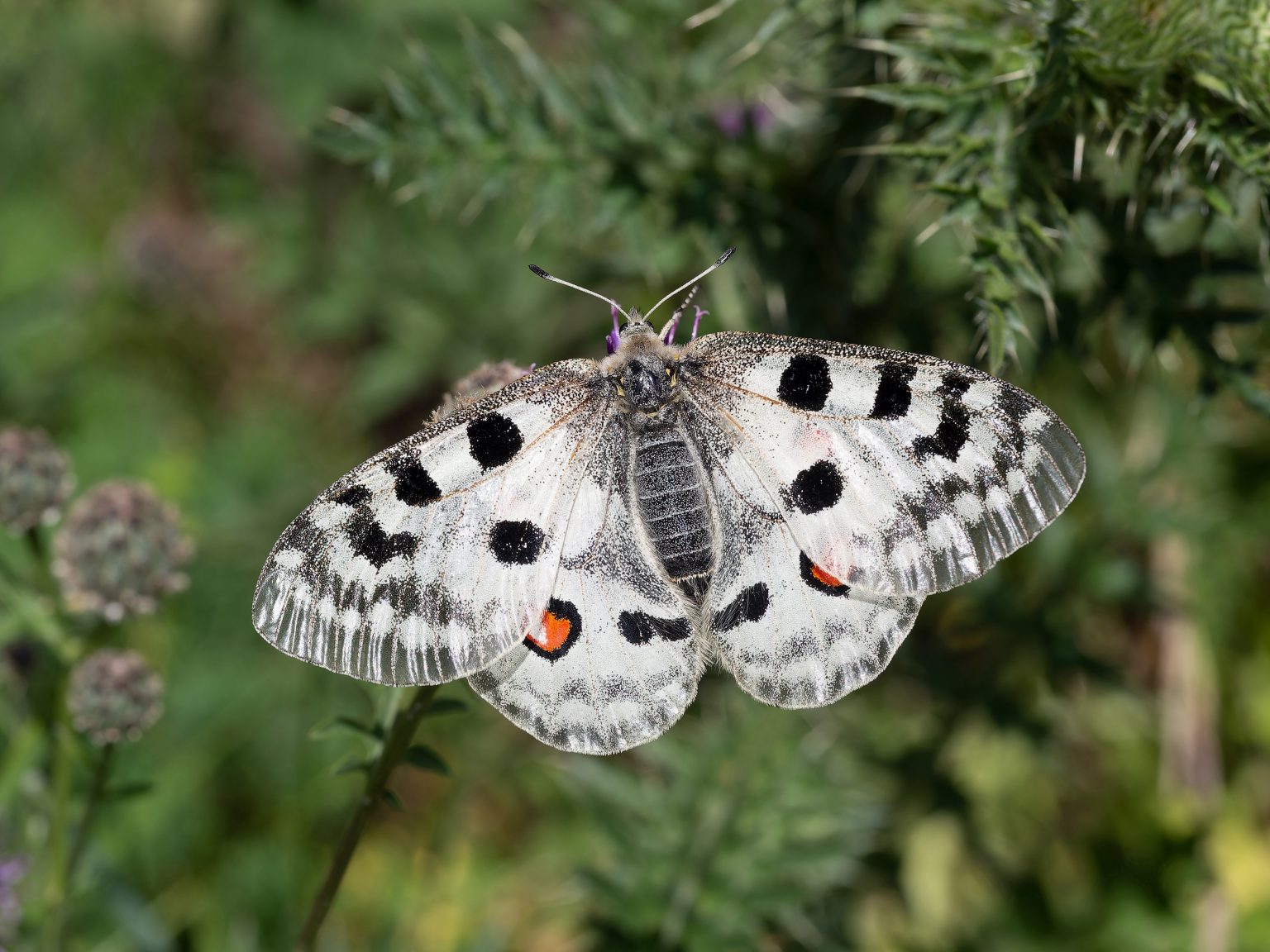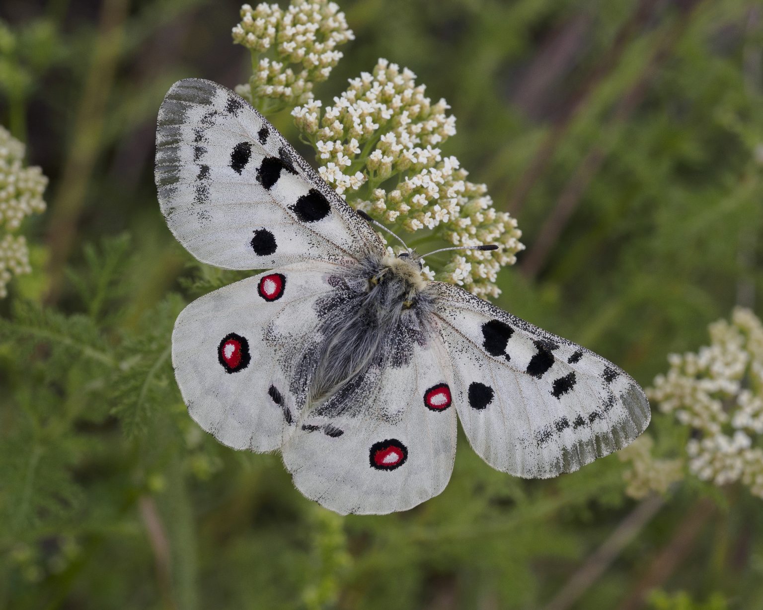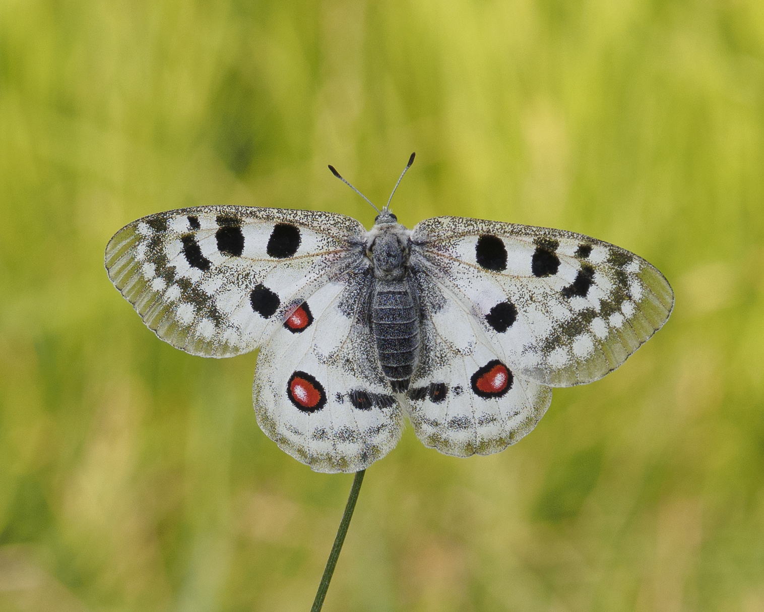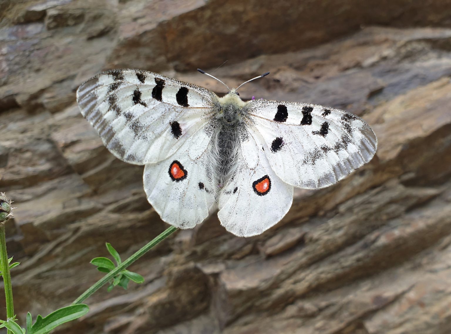 In dieser Stellung offenbart der Moselapollo die Verwandtschaft zum Schwarzen Apollo (Parnassius mnemosyne), der keine roten Augenpunkte trägt.