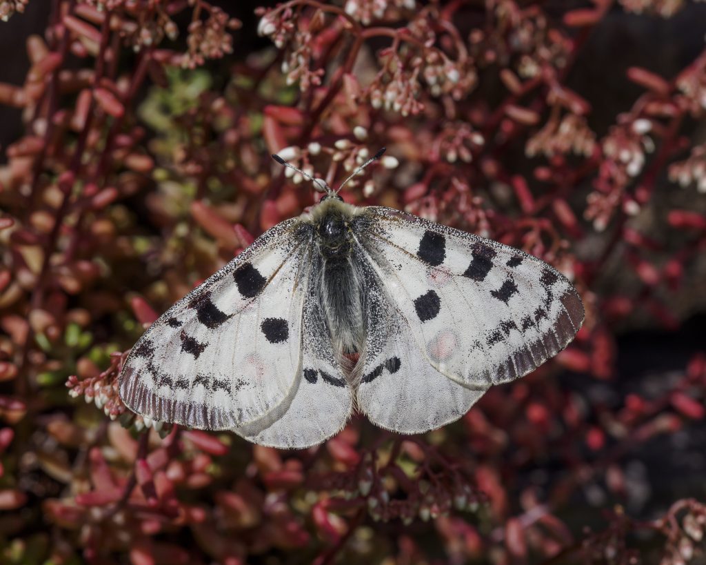 Nach etwa zwei Wochen ist die Entwicklung vollzogen und der fertige Apollofalter schlüpft. Ganz konnte dieses Weibchen die Puppenhülle noch nicht abstreifen und ein kleiner Rest von der Puppe schmückt den frisch geschlüpften Schmetterling. Nachdem die noch stark zusammengefalteten Flügel vollständig geöffnet und ausgehärtet sind, schwingt sich der Apollofalter in die Lüfte und der Zyklus beginnt von vorne.
