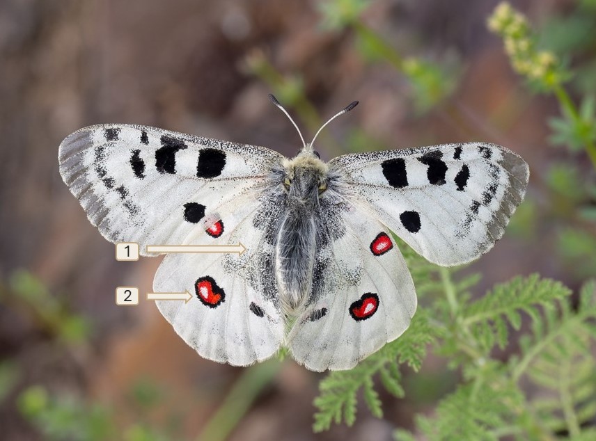 Die typischen Merkmale für den Mosel-Apollofalter als Unterart des Roten Apollos sind die kleinen weißen Stellen an der Basis (1) und die vier markanten nierenförmigen Augenflecken auf der Fläche der Hinterflügel (2).