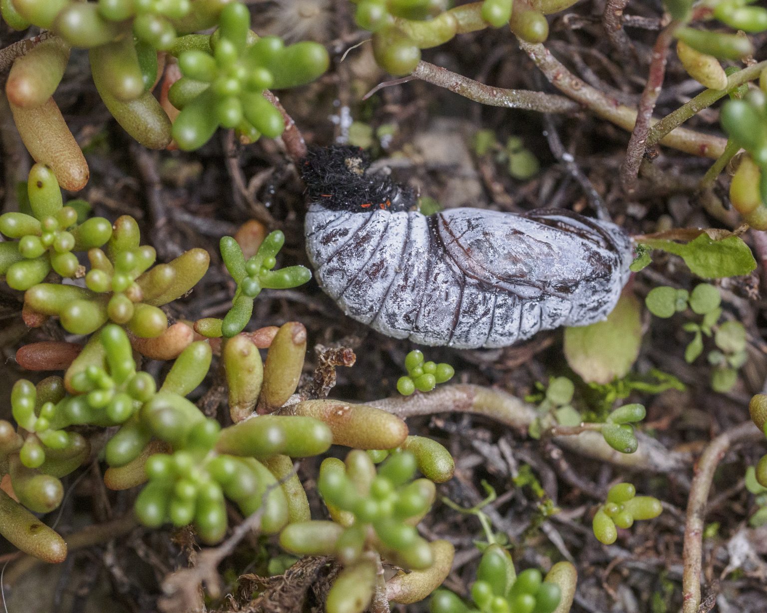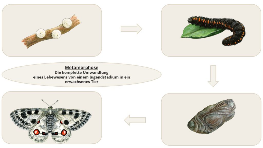 Vom Ei über die Larve zur Puppe bis hin zum Erwachsenenstadium, die sogenannten Imago, durchläuft auch der Apollofalter eine vollständige Metamorphose. All diese Verwandlungsphasen bergen Risiken und sind sehr anstrengend für das Tier.