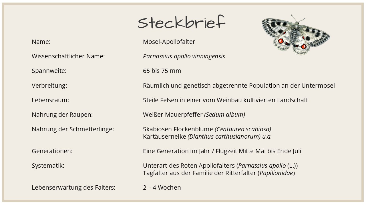 Der Mosel-Apollofalter ist eine Unterart des Roten Apollos (Parnassius apollo) und wird, wie weitere in Europa bekannte Unterarten, in die Familie der Ritterfalter eingeordnet.